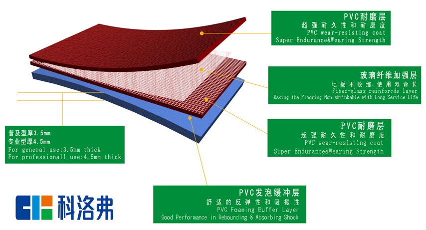 運動地板的結構 一. 運動地板由TPU處理的表層、PVC耐磨層、1000D的玻璃纖維補強網和特殊網格布纖維加強層和PVC發泡緩沖層組成。
