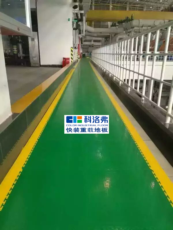 5、無膠水安裝  快裝重載地板的安裝無需與原有基層結合即無需膠水貼合,可以在起沙、起殼、燒壞、開裂、無強度、重度潮濕的水泥基層或環氧地面上直接進行覆蓋式安裝,此項功能特別適用于因生產繁忙而無法停止生產進行地面整改的工業廠房地面,直接安裝直接投入使用。 6、維護維修極其簡單無特殊維護要求,采用普通清潔方式打理,且地板損壞后也可自行更換無需專業人員操作。