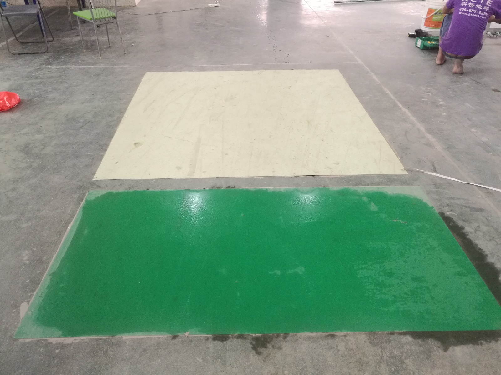 科洛弗工業地板施工中,工廠原地面與施工后的工業地板地面的對比