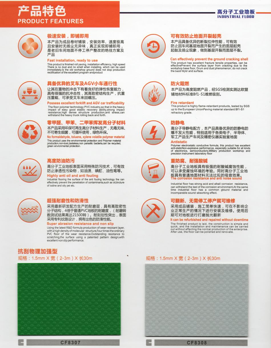 10 超強(qiáng)耐磨:在人流量較大的醫(yī)院、學(xué)校、辦公樓、商場、超市、交通工具等場所,尤其是要求嚴(yán)格的工業(yè)地面,高分子工業(yè)地板越來越受到歡迎。